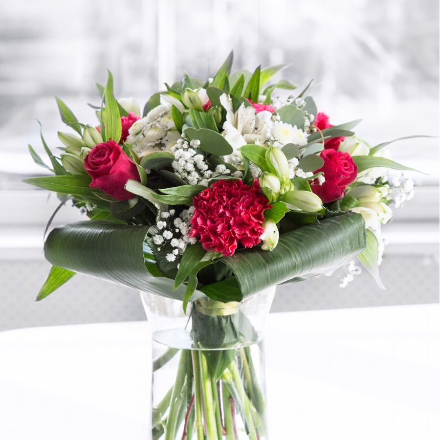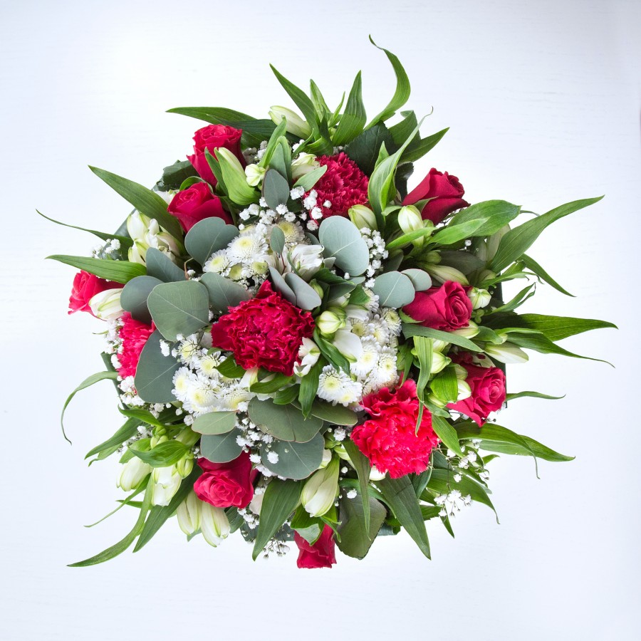 Our Exquisite Red & White Floral Delight bouquet is designed to inspire and enchant. Featuring a stunning combination of white chrysanthemums, gypsophila, and luxurious red roses, this arrangement is enhanced with carnations and elegant white alstroemeria, all set against aspidistra leaves.